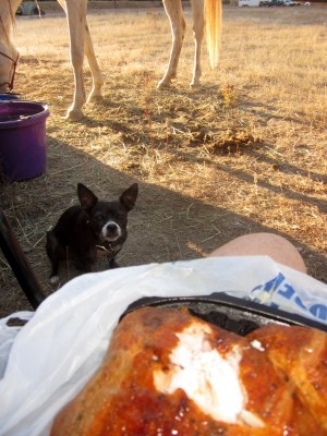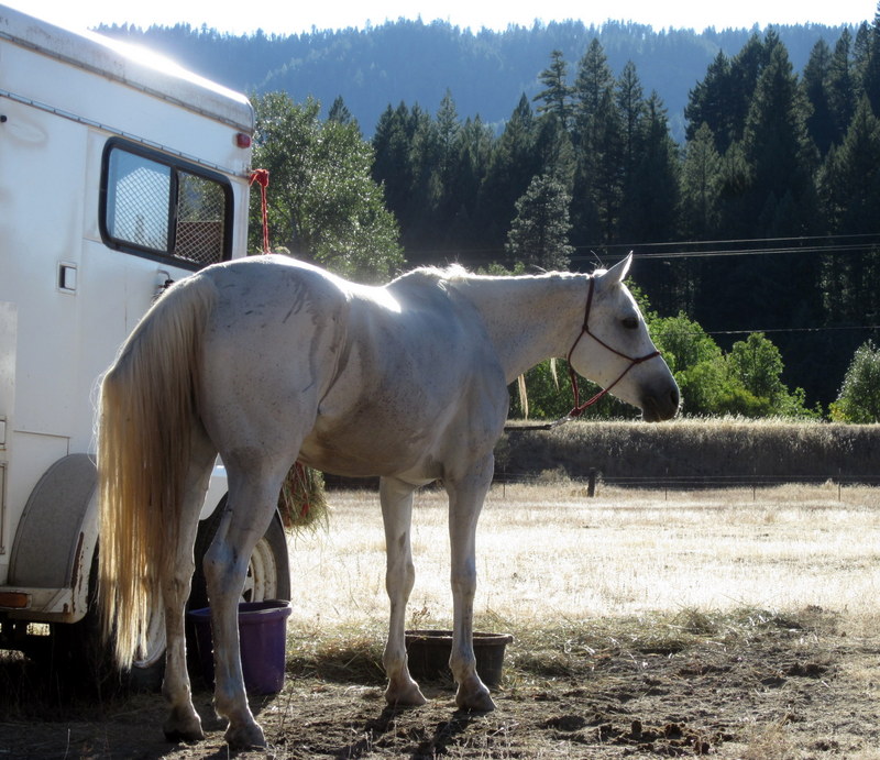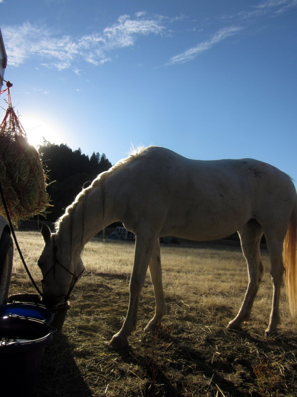 At the hold Desire and 2 other mares engaged in a food swapping munch fest, complete with occasional pinned ears and squealing, but other than that typical behavior I’d say it was quite peaceful for 3 hungry, unacquainted mares. Desire *did* let anyone coming near her current favorite mash know that she would prefer them to Disappear. We vetted through with all As but a slight sore spot on her left side, under the cantle pack. I vowed to do more time on foot and slathered Desitin on the spot before re-saddling.(I know now I should have taken off the damn cantle pack, too!)