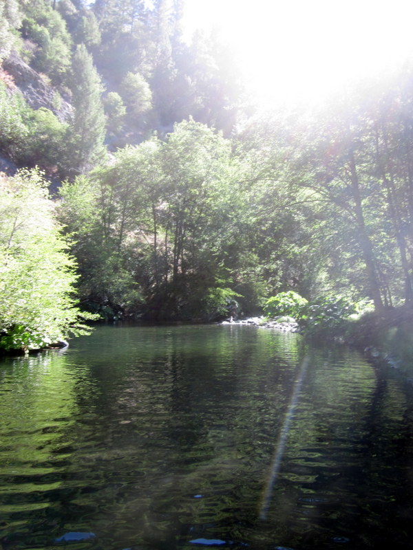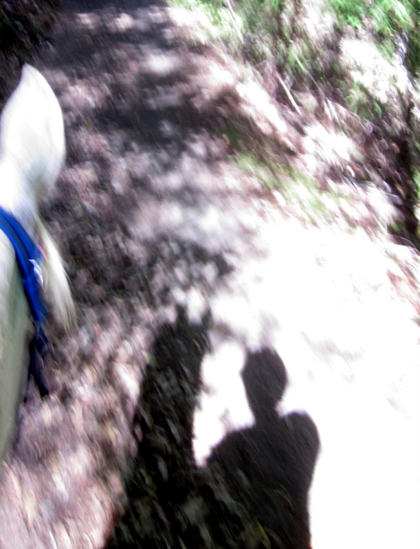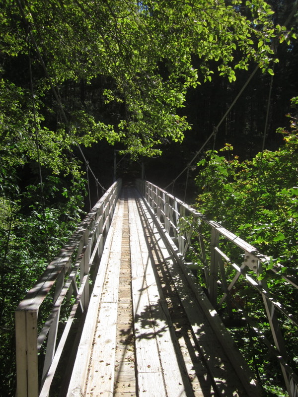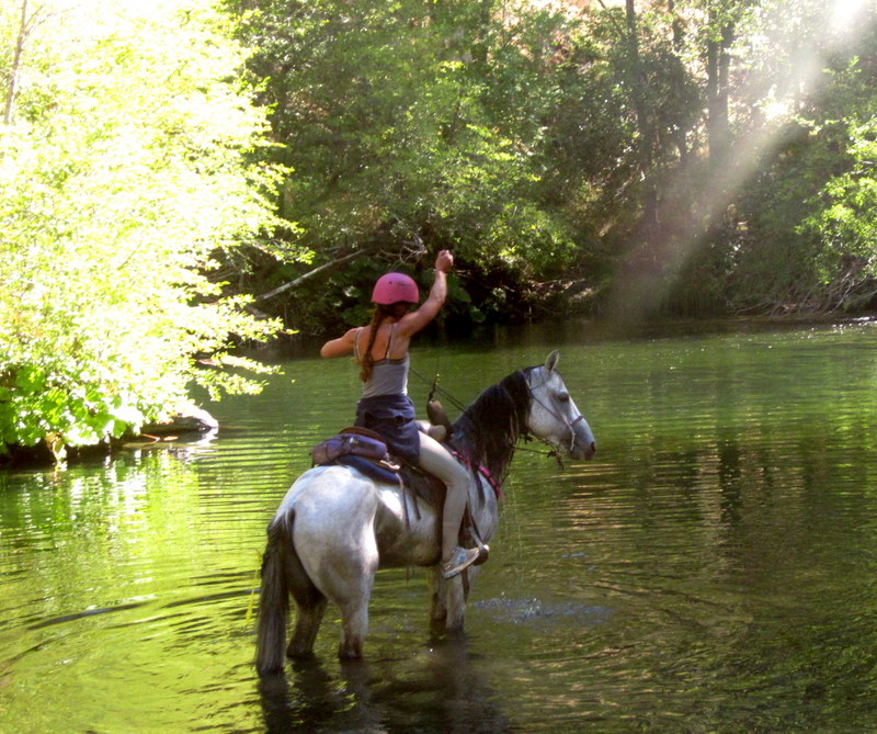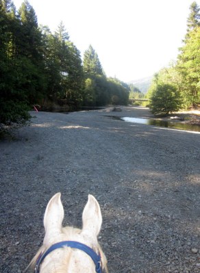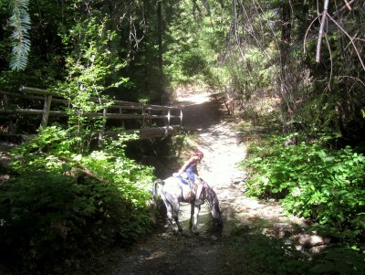 After the river crossing we were moving out on some of the most fun trail I have ever ridden on. Perfect footing, shady single track, winding along above the river. Desire put on her power trot and we just flew, I couldn’t help but laugh with delight. We only slowed to cross the “swinging bridge,” there was a sway to it and Desire was a little snorty, but we rode across it no problem.