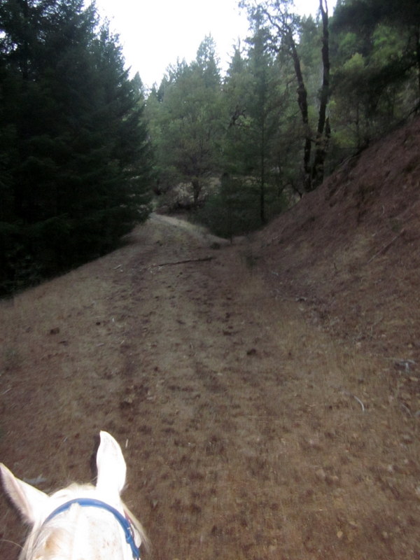 My planned “leg stretcher” ride quickly became an “Holy Shit, we’re really going on/up this?!” ride. From camp it was a 4 mile climb of some few thousand feet to the top of the ridge where the trails took off in various directions, and a few miles of that trail was hand cut by the ride managers this year in preparation for the ride. It was tough riding it, I can only imagine how hard it was to make it! There were steep bits, narrow bits in deep dirt on the side of hills (read: sliding out in the hind end if you’re riding a klutz), vicious fist sized rocky bits and all combinations of the aforementioned–and it felt like it just went on and on! It turns out I was almost to the top and out of the sketchy bits when I decided it, but at that point I concluded I was going to lame my horse before even vetting in and turned around and hand walked her back down to safer ground, my brain buzzing.