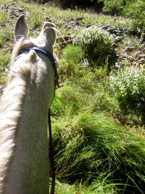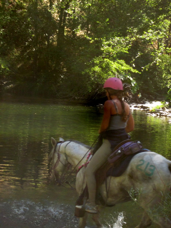 There was a long, fairly steep hand cut trail descending to the river crossing, and Desire was aware of A and Alamahn some ways behind us the whole way down. A group of 6 riders were in the water when we got there and I was determined that we were going to stop, drink, eat, take a breath. Desire gets so driven and focused, while she is doing what I want her to do pace wise, she can have a hard time just stopping and taking a breath. Shocking for an Arab, right? Harhar. Still, I was determined to get more food into her on this ride, even if it was just handfuls of grass and bits of carrots along the way. She eats well at camp and holds but I wanted her eating more between times, especially since this ride had just one vet hold, about halfway through. I prefer that actually, more than one vet check during the ride gets tedious, but it meant a lot more consistent moving time and fewer chances for her normal eating patterns. I carried a baggie of cut up carrots as usual and would turn her head and cram one in her mouth once in a while, and she was enticed by the grass here and there, especially if I picked and hand fed it to her.