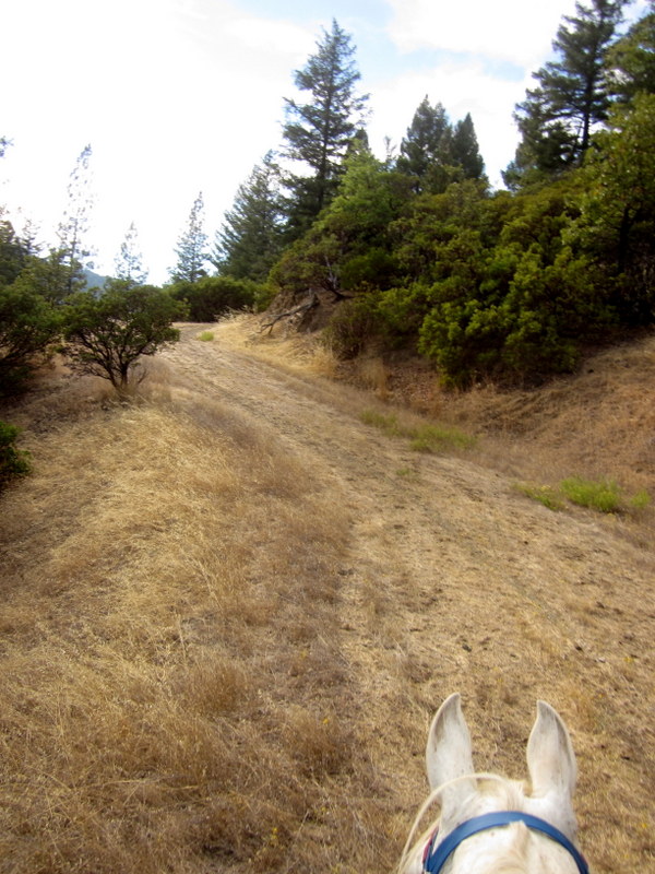 Desire didn’t drink at the first few opportunities and we trotted along some nice dirt roads, a welcome break after the intense early climb. I dismounted at some water troughs to electrolyte her and see if she would stand still long enough to drink, but two trucks of hunters roared up in their big trucks and started quizzing me on the trails so the whole tranquility thing was out the window and drinking did not happen. I did cram a dose of EnduraMax-Plus down her gullet and she in turn had a good, long pee. This is good, I knew drinking was in her future now that she was more comfortable.