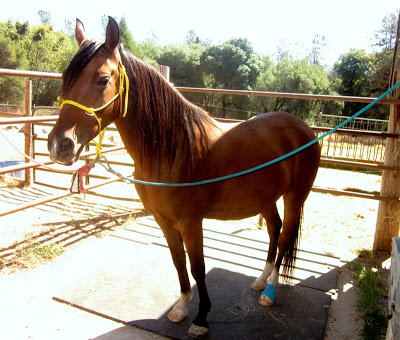Joey is turning out to be quite a good little bay patient! Initial hoof treating/wrapping took over an hour & lots of patience; today’s hoof re-wrapping lasted 10 minutes, which was comprised of 8 minutes of grooming & 2 minutes of re-wrapping. A few nervous dances, a new tried evasion method of throwing his hip at me instead of away –his hip met a pointy finger & he didn’t try it again–& he just stopped. Took to standing with his sore hoof cocked &perfectly accessible, didn’t move a muscle as I cleaned the area, re-wrapped his foot, fussed with the wrap, & even rubbed on his Precious right hind leg, since it was handy & he was relaxed. Good Boy. He certainly doesn’t mind the perks of 2 mashes a day (to deliver meds) either!