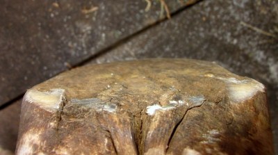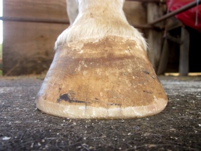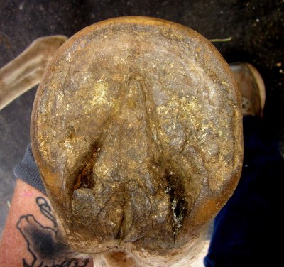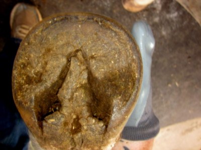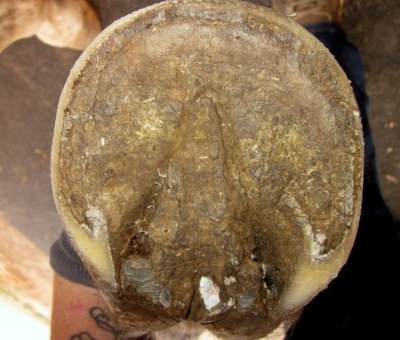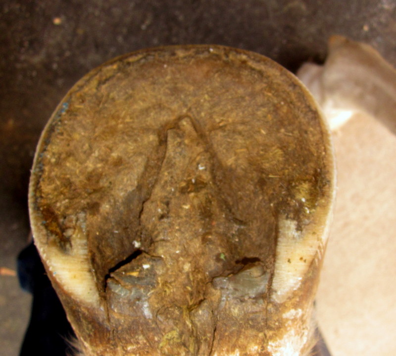 Left front, mustang roll. The pink spot on the lower right hoof wall is the last of her old flare growing out