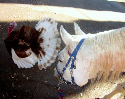 We let our solo SuperTurkey, Lex, out to free range around the property during the day and he is having a great time following any and all humans around and alarming the horses with his popping and clucking and gobbling.