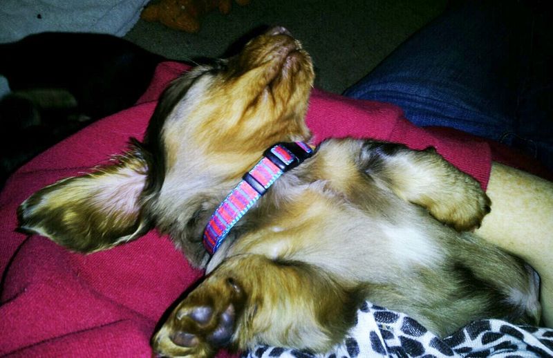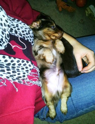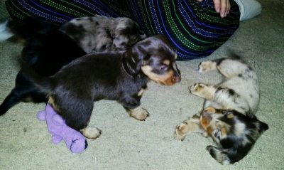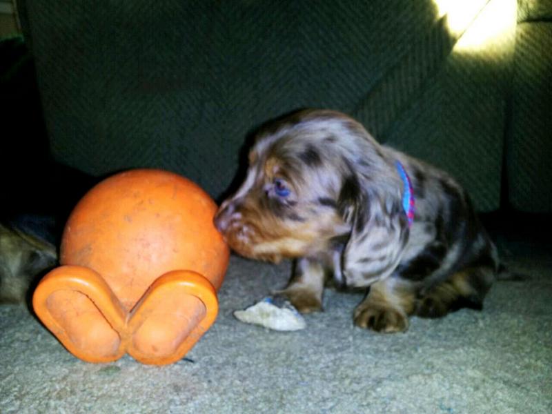 Good guess but no! Hahaha, it's a Miniature Dachshund! Actually a little..ermm…cousin?nephew? of our 3 yr old Doxie Wilbur. I don't remember bloodlines of my horses let alone dogs but he's from the same breeder only a long haired Doxie which is what they breed for. Our Wilbur was the one smooth Doxie of the year that year that we got him 🙂
