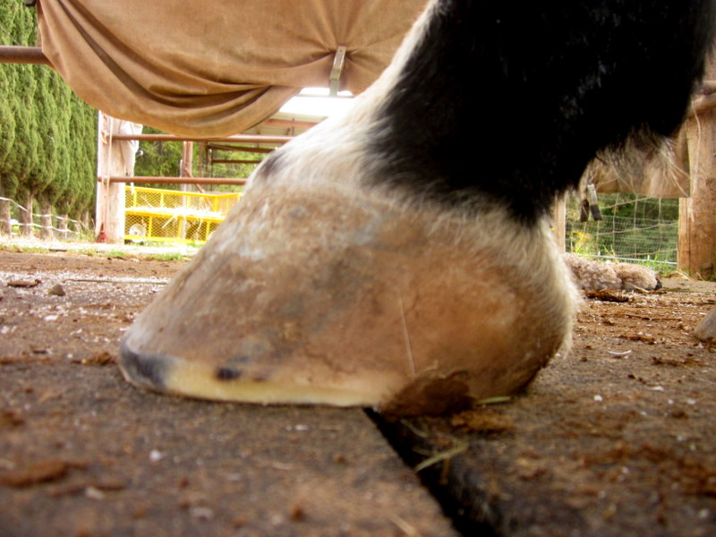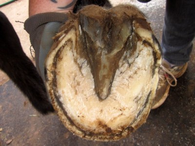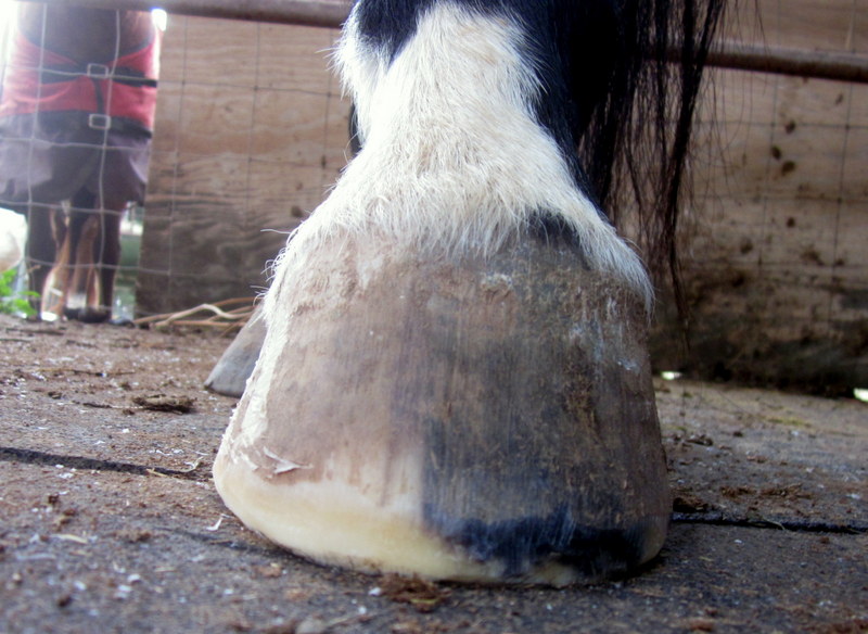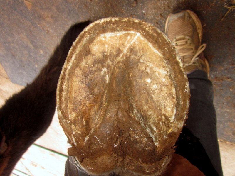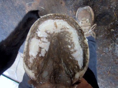Blaze right front, the smushy heel on the left side of the pic is getting better, quarter crack on the right, I am still learning to scoop the quarters and keep his flaring down