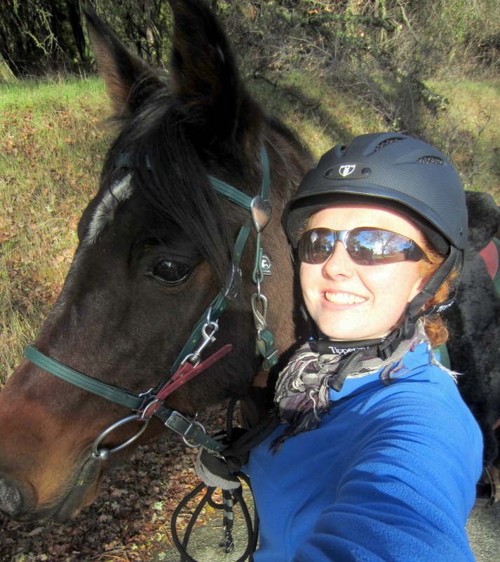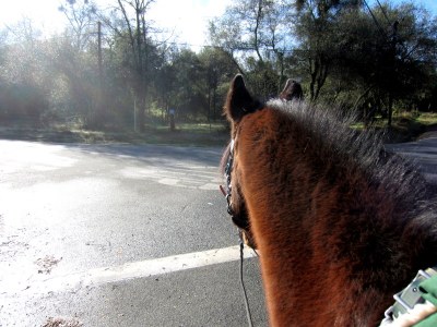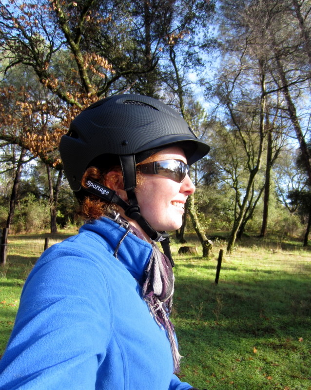 I had a spanking good ride on Blazey boy, who snorted and balked and even thought about bolting away from terrifying things like new fences and old traffic cones. After a few miles he settled right into his sky-high trot and much more enjoyable canter, even collecting up nicely with light contact. My grin was a mile wide to be out on my boy again–see there it is: