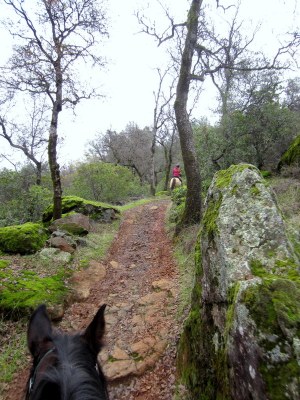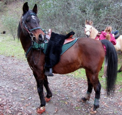 J hand walked Sedona the last 3 miles or so back to the trailers, which was of course all uphill. I hiked with her, out of solidarity, and because I could use the narrow trails to keep Blaze moving forward straight ahead as I kinda-sorta taught him to Tail. He was eyeballing me suspiciously as I lurked next to his rump and played with his tail, but he’s such a good natured sort that the worst he did was circle back around me a few times when he found the space to pull it off. Incidentally, hanging out at his rear is a MUCH easier way to get a good forward walk out of him–if I lead him from in front he walks like a dying farm plug!