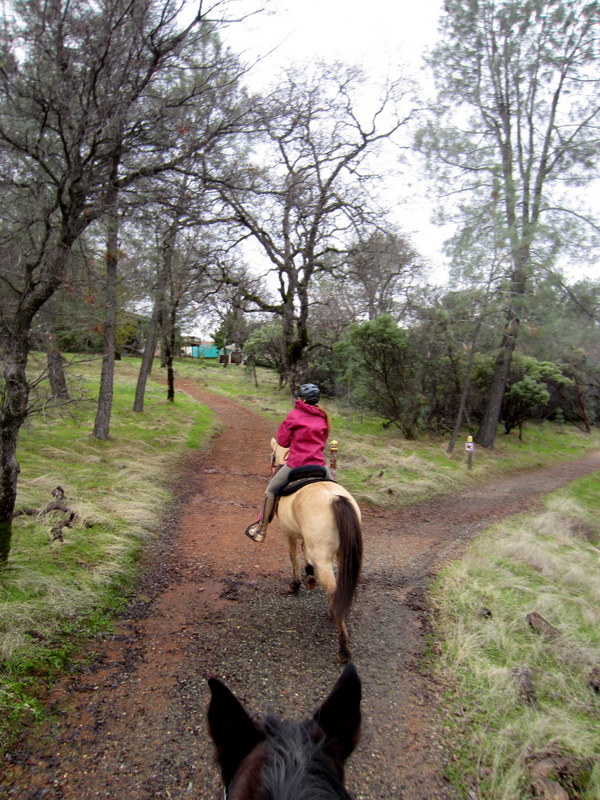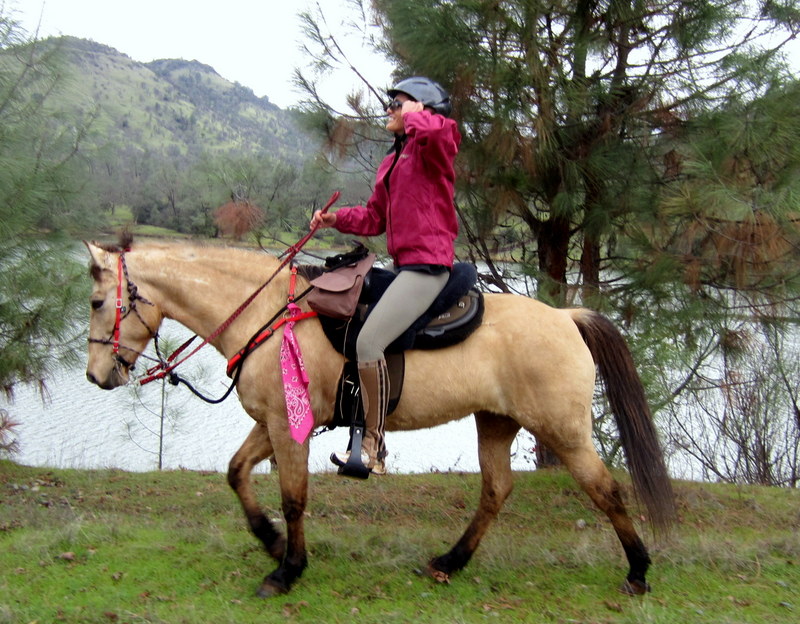 J noticed something was off with Sedona so she started hand walking her, then noticed her cell phone was gone! The darn bag just ripped right off and silently disappeared. J had a long haul back home and was concerned about her horse, and to really cheer things up, it was starting to rain. I told her to keep walking for the trailers and Blaze and I slithered our way back down the trail in search of the little black case. We had a spanking canter along the good footing on the gravel road along the river, then spotted the case lying plain as day, asking to be retrieved. Another good canter back towards the trailers and a few more miles and we caught back up to J and Sedona.