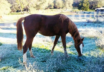 I’ve let Sheza out of her pasture gate the last few mornings and she jogs right out like a dog on my heels to go for a wander. Everyone else causes a ruckus and declares No Fair; Sheza expands her horizons with some shenanigans, snorting, heel kicking up, oh, and lots of Eating. Eating, my friends, is a priority passed onto this red beast by her mommy dearest, Desire. Those two go through chow like Clydesdales.