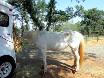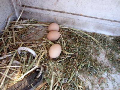 Moving the hay net in the trailer manger uncovered this contribution from our chickens. Omelette anyone?