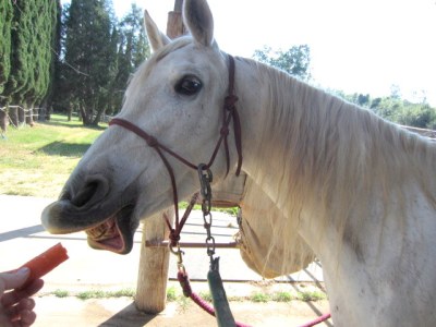Yes I am bribing her with a carrot to get anything besides listening-to-spillway-roar-behind-us ears–semi successfully, I might add