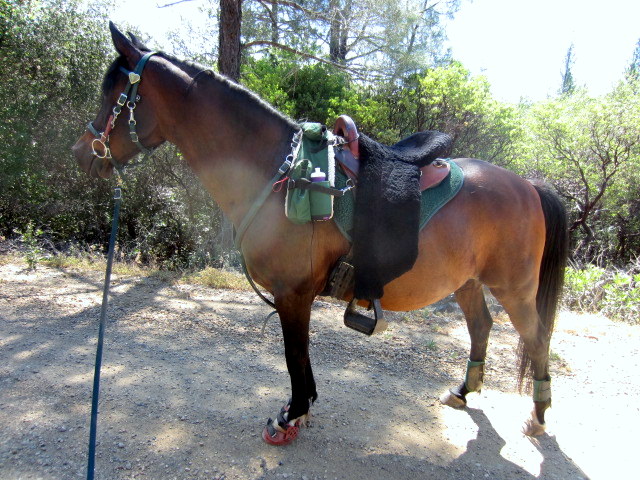 I wanted to spend time with my own horses this morning, so Blaze and I cruised to the top of the ridge. After a few hot days the temperature dropped significantly again last night; today is easily 20 degrees cooler than yesterday, so I climbed most of the steep ridge on foot, listening to Blaze clop clop in his Renegades behind me.