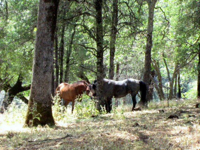 Joey’s new pasture mate is a gorgeous blue roan half Mustang mare who threw one good left hook at Joey before they headed off up the hillside together to graze busily and ignore humans.