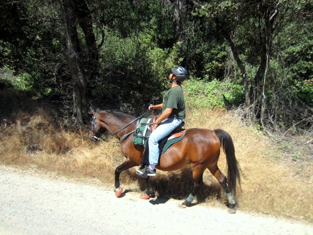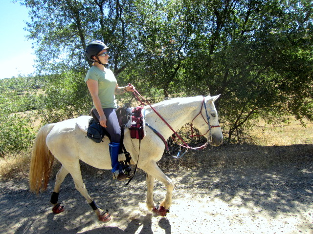 We cruised out through the neighborhood and Blaze walked out nicely for J. With J not used to saddle time and the vet scheduled in a few hours we figured we’d go a few miles and head back. I had just bought a pair of size 2s last week, since both Desire and Blaze wear size 2s and I only had one well worn pair. I congratulated myself on my planning ahead, since it meant I had four size 2s (but no spares) to slap on their fronts when J randomly wanted to ride. D is wearing the new burgundy 2s here: