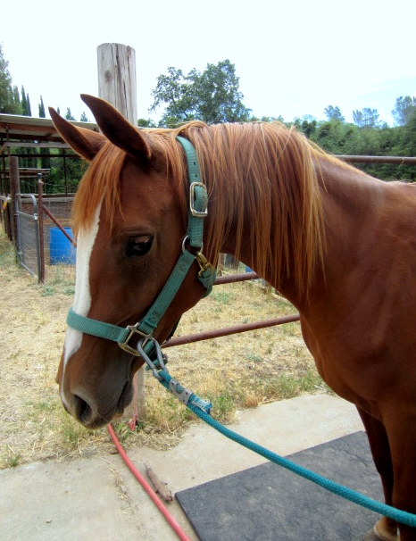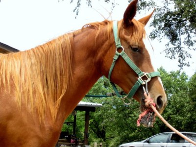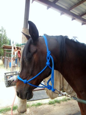 I was all ready to post gorgeous photos of my redheaded filly in her shiny new blue rope halter–but I have a redheaded filly, so she instead remembered that she *hates* new things that smell of Store, and only wanted to wear Blaze’s stanky old green halter. She is SO her mother’s daughter. New halter? Eyeballs wide, snorting, jumping away. Old horsey smelling halter? Sticks her nose in it and waits to be done up.