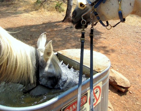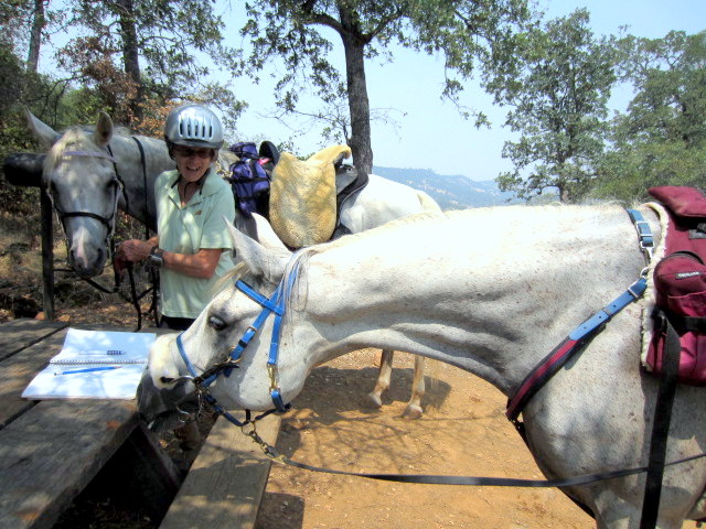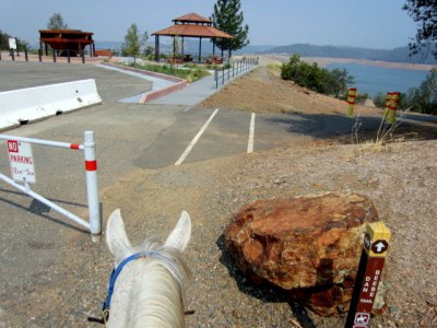 Temperatures finally cooled today and N and I had a chance to meet at Lake Oroville for a morning ride. There was inexplicable, fairly heavy smoke over the lake and enough smoke for pretty decreased visibility over the valley. The air didn’t smell smoky and neither of us were aware of a wild fire. You can sort of see the grey tinge in the sky over the lake in the photo below. Also pictured, the spooky horsey obstacle course. Fortunately Scrappy isn’t very spooky and just slowly walks past this sort of madness with his head low, snorting softly.