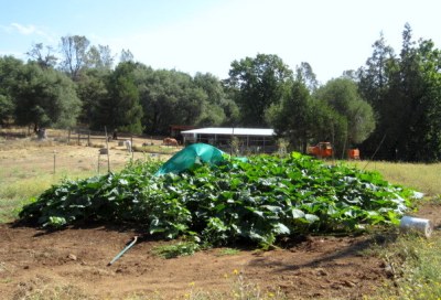 Here is this year’s giant pumpkin patch. The 2 pumpkin plants were planted under that little green tent in the middle, in the beginning of June. They have grown a bit!