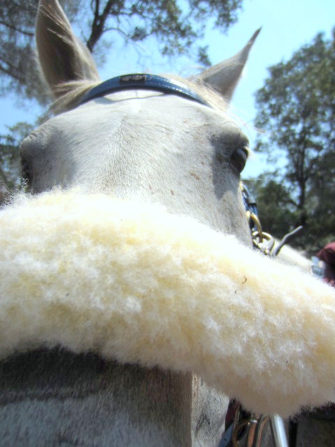 Today’s tack testing included a new fleecy girth and a fleecy noseband cover. I Desitin-ed Scrappy’s armpits just to be safe, and the fleecy girth didn’t give him those weird lumps or rub any hair or skin off, woohoo! Also got a great, even sweat mark with the Woolback and western Abetta again, with not even the bat of an eye on back palpitation. I noticed the S-hack rubbed some hair off his nose last time and the fleecy noseband cover remedied that issue nicely today. We did a fair amount of relatively steep up and down riding today and the saddle didn’t seem to slide at all. I’m amazed how well that small Woolback keeps saddles in place with no keeper straps at all!