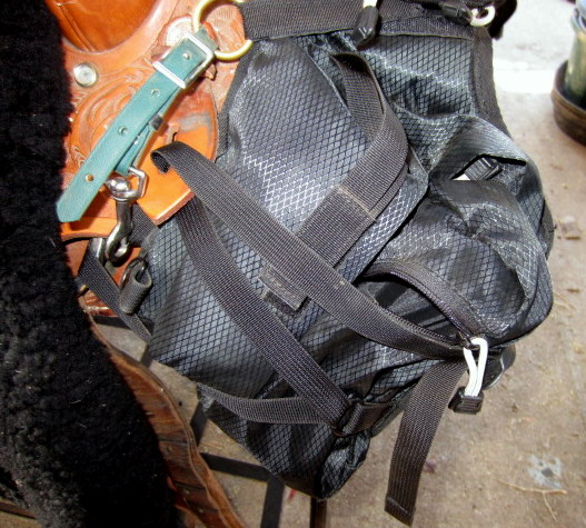 I rigged my pommel bag on using the ring I added up top, the excess girth strap tabs on each side, and taking a turn around the girth rings each time. This is the larger size pommel bag and had lots of long straps.