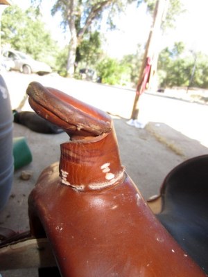 I bought the Abetta from a friend a few years ago for a few hundred bucks,as it fit Desire when she was fat and rolly polly. I was bringing her back into condition after I weaned Sheza, didn’t have my Specialized yet, and the Abetta was comfortable for me and Desire at the time. Since that time I’ve thrown it on Blaze a handful of times to set kids in for a few minute “pony ride” and that’s about it. It doesn’t really fit Blaze and I wouldn’t use it on him for a real ride of more than a few hundred yards with a child clinging on it to the horn. Basically, it really worked for that because it had a horn! Well now that I wondered if it wouldn’t just fit new guy Scrappy’s short, straight back, I quickly decided that the horn was the main liability. Having started in and preferring to ride English (and now endurance-style saddles), I’ve knocked the wind out of myself on a western saddle horn leaning forward instinctively to charge up a hill, and caught my bra on a horn when dismounting. I know lots of people are used to them and consider them an asset but I knew I wouldn’t want to deal with it on 30+ mile rides. Also, the awful little hard leather stirrups were unbearable for my feet and the seam in the saddle wore quarter size raw spots on my inner thighs on a hilly 13 mile ride the other day. Clearly this puppy needed some tinkering to become endurance ready!