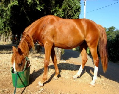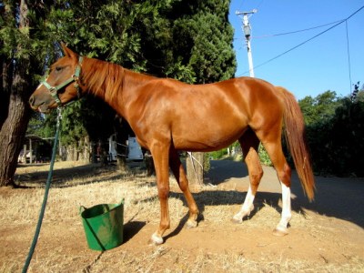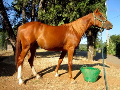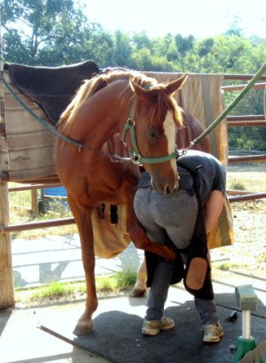 This morning it was Sheza’s turn for a thorough grooming and hoof trim. I swear to you all, she is Dr. Jekyll & Mr. Hyde in red filly form. True to character she jammed her head excitedly in the halter (she currently prefers wearing Blaze’s faded old green one), then pranced and pirouetted and snorted her way over to the cross ties, half remembering sometimes that there was a person attached to the lead line. On the way I made her pay attention, sort of, we backed and circled and moved around and rolled the whites of our eyes at each other until she was relatively polite to lead, and I do mean relatively. Once in the cross ties she promptly began pawing the ground obnoxiously, and as I began working on her feet, she gave her customary One Big Spazz. If I recall we didn’t have any Spazzes the last few trims but the weather this morning is deliciously cool and well: Sheza- brat. The Big Spazz consists of surging forward dramatically, half rearing, throwing herself backwards while pulling back and thrashing like a fish, and then stopping to stand quietly, licking and chewing. After Big Spazz she is usually completely quiet and polite to have her feet done, as she was today. Mr. Hyde gets haltered and Dr. Jekyll sweetly nibbles my neck while I roll her toes…