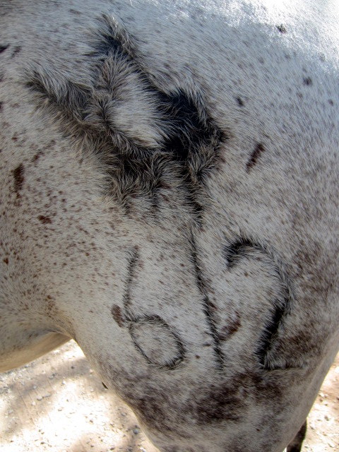Here is a close up of Scrappy’s wonderfully/terribly botched Rushcreek brand. That’s supposed to be a 3 leafed clover above his number..