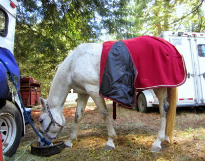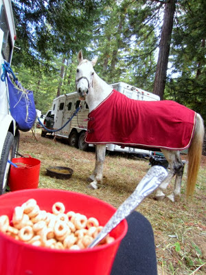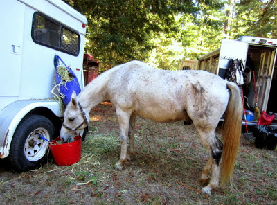 I was quite cozy in my tent as usual, slept fairly well, and re-stuffed Scrap’s hay bag around 3 am. About 6 I wandered over to my awesome camping buddy J’s set up for breakfast , then back to tack up by 6:30: