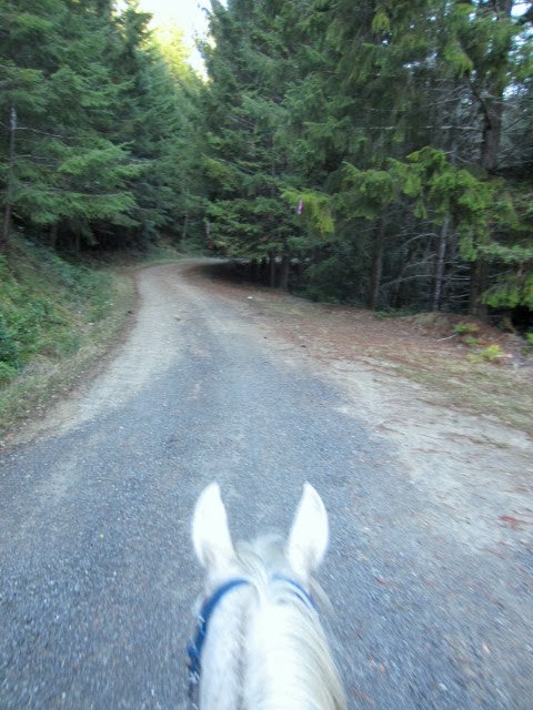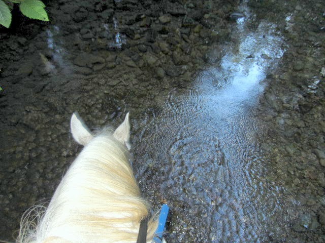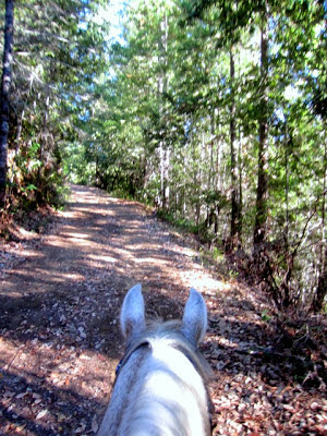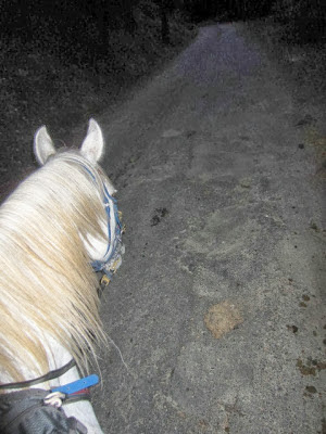 All I did was wear different socks on Friday. Not on the ride, just on Friday on the drive to camp and the walk with Scrappy and my mom. Halfway out on that walk Friday afternoon I felt Ouch start and by the time we got back to camp this was what my heels looked like. I knew that if we continued riding the 50 and an issue did arise, my much bandaged heels would not tolerate much hiking. Unless I did it barefoot myself, and yes I did consider it. I’m barefoot all the time at home and there’s no thistles here! the insane little voice in my head whispered as we plodded along the cool dark forest trail. It’s truly a unique and sweet torture to be at that place in a ride where you are alone, questioning everything, and it really is an especial twist when it comes so early with all seeming to be going so well.