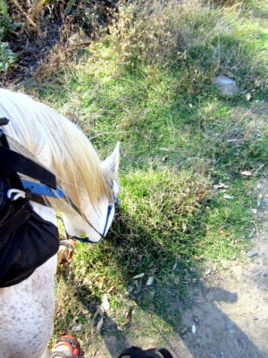 Today I did two things differently and both of them worked. Firstly, I decided to try driving Scrappy down the trail while on foot to help alleviate the “dragging a dead thing” effect when I lead from the front. Blaze trained me well with this one and as luck would have it Scrappy took to the same method I’ve used on Blaze well. Basically I just position myself at or just behind his flank, the reins unclipped and run up and behind the water bottle in the pommel bag (not attached in any way, just tucked behind it to keep the rein in place where I want it), and in my hand. Mostly the horses are motivated to walk out nicely just from my presence back there and clicking to them but I’m also handy for a rein or crop pop if I really need to refocus or drive them. The areas of trail I did this were narrow enough that Scrappy couldn’t easily veer off wherever he felt like and he walked out really nicely this way.
