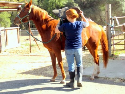 I didn’t even put stirrups or a girth on it, just keeping things super low key. I did pull the saddle on and off a bunch and set it back up there from each side repeatedly. She raised her head and tensed a little at first movement of the saddle each time but immediately relaxed and kept snuffling for goodies. She really is quite sensible for a Haat gal!