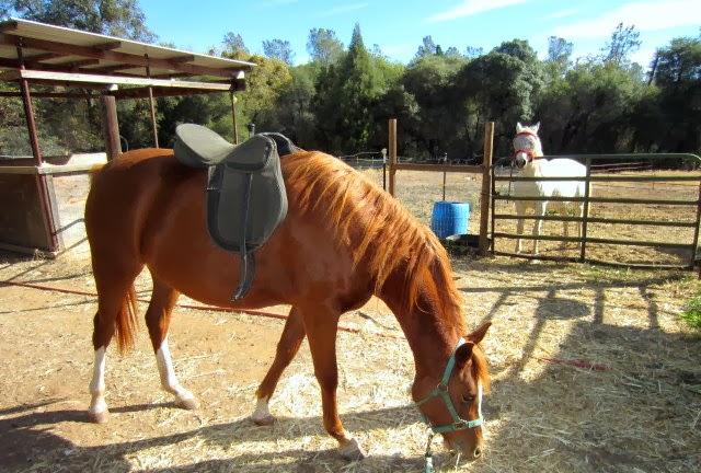 I’ve noticed that in the last few months Sheza has been running around like a nutter enough to self trim her hooves a bit. At least, there wasn’t the insane sloppy toe growth within a few weeks like previously. Anyway she was certainly due for a maintenance trim and a fall de-worming today, and then since she was being such a good girl that I causally slid on a near weightless English Wintec saddle–courtesy of Nikki’s LoanNTack–and let her wander around with that for a while.