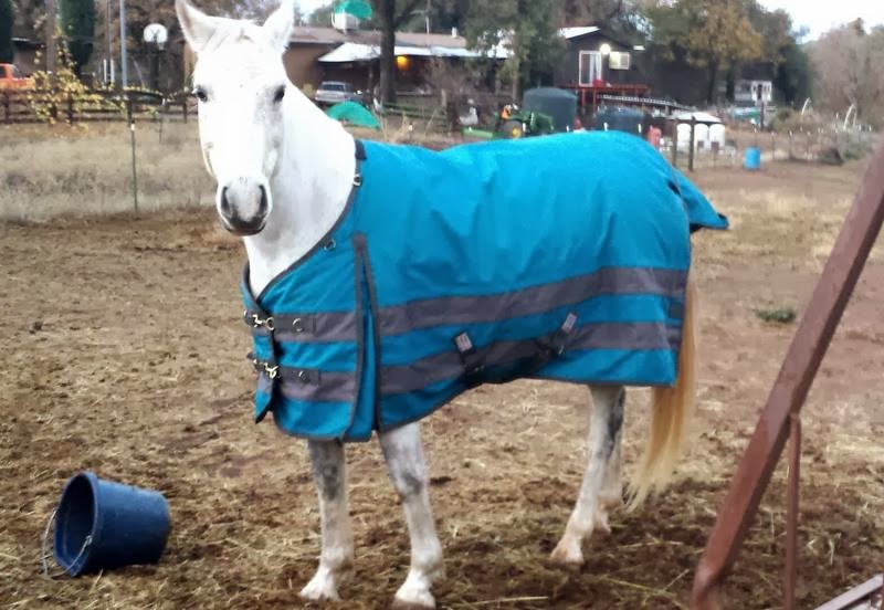 We got a couple of inches of rain early last week, and overnight horses and property were transformed from endlessly dusty to mucky, sloppy, winter. I didn’t believe the rain’s enthusiasm and ended up soaked through a couple of times, wearing inadequate outdoor gear at feeding time. Desire either rolled or lay down in the rain one night and she and her faithful Schneider’s blanket were soggy, bedraggled messes come mornin, with more rain forecast. Fortunately N’s TacknShare had loaned me a really handsome purple turnout that fit really well and kept her snug and dry until the storm passed.