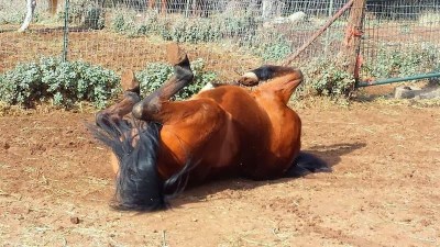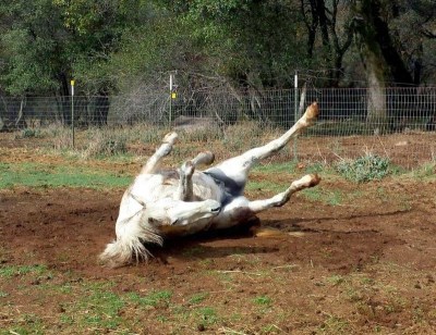 Scrappy has made himself a perfectly round and well maintained dirt/mud hole at the top corner of his pasture, here he is doing his daily maintenance on it: