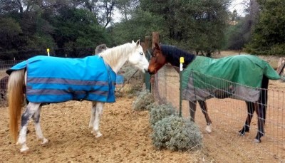 The initial forecast of 20mph winds and rain sent me out to blanket Rambo on Wednesday, for the first time since his arrival a few weeks ago. I’d seen a picture of him looking distinctly not amused wearing a blanket for the first time a few weeks before he ended up with me, so I knew it could be done but didn’t know *how* it had been done and therefore what I was in for. But who cares? I approached him the same way I approach all the others here whether they are 2 or 18: showing them the blanket, letting them sniff and snort at it if they are feeling particularly Arabian that day. Rambo did just that, waiting politely to be haltered then eyeballing the blanket and sniffsniffsniffing as he does. He is very scent oriented and when nervous smells everything like a bloodhound and also marches around doing the phlegmen lip thing pretty often. It took all of 30 seconds to progress to rubbing the blanket on his face, neck, and then as he didn’t seem worried, sliding it over his back and into place. It was well seated and he got nervous with it over him and started to walk away, so I didn’t let him RUSH away, but I did let him walk, with my hand on the lead and on his side, calmly. He walked to the Sheza/Napoleon/Scrappy fence lines and stopped, sighed, cocked a hoof, and then stood like a rock while I cinched Blaze’s sheet down around him. I can see that he is a horse that needs to move his feet and could be explosive if someone didn’t understand that and tried to force him to just STAND for things on principle. My theory is he will get to that point, but allowing him to cope in his way, within reason, makes for a more positive experience in the beginning. Do I want the blanket to mean a fight, or a noneventful weird human thing that just meant more carrots? I think you know the answer!