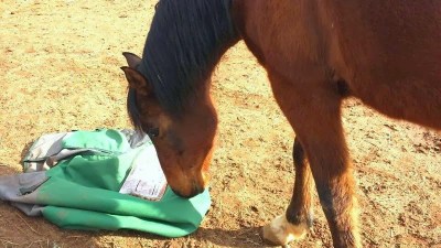 Rambo got a little squirty by the blanket sliding off his butt and trotted away from the plastic-y sheet sounds, so I parked the carrot bag on the blanket and turned away to “fix fence,” just seeing how long it’d take him to come back and check out the scenario. OH, I’d say about 15 seconds on that one, and funnily enough he didn’t stomp/chew/drag anything, just sniffed as below and then waited for me to give him another carrot.