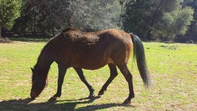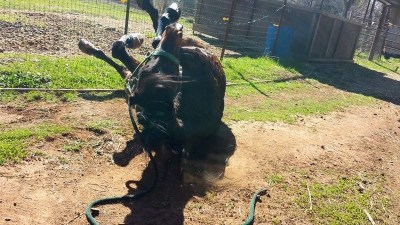 On the 15 second walk to his paddock after a semi-bath, Blaze hurled himself to the ground in protest of being Clean. He rolls many times a day, every day, and hates any and all version of cleanliness!