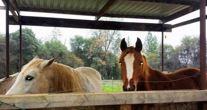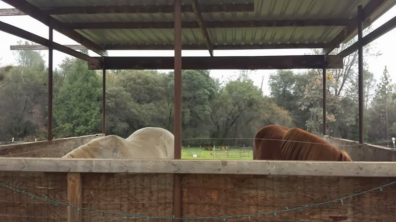 The horses have been in various states of undress, in the barn, out of the barn, who knows what to do with this weather. Fortunately it’s not a cold storm, even with the rain coming down, so they’re currently toughing it out naked. In fancy sheds.