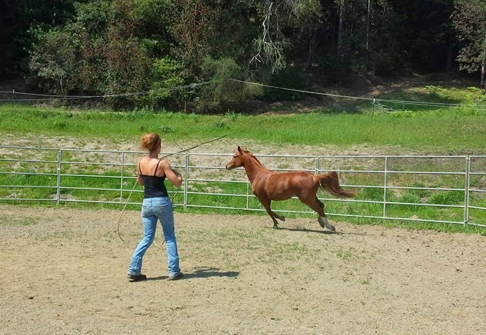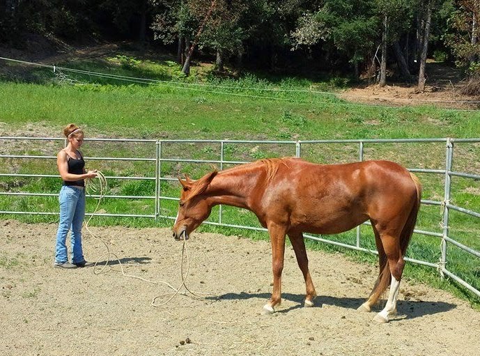 April worked in the way of creating herself and her tasks for the horse as the happy quiet place, while giving the horses the opportunity to either commit to mistakes or commit to staying put and working as requested. I watched April work this way with a feisty, recently gelded, and barely broke paint horse on this day, and then work in exactly the same way with Sheza. The difference was in the horse’s level of commitment to good or bad behavior. April only escalated energy as the horse did; it took some aggressive body language in response to the horse’s aggressive attitude to establish her space with the paint, while aggression is not high on Sheza’s response list. She tends to commit to spooking out and being dramatic at first, but quickly started to face up, think, and realize that her jamming around brainlessly was on HER and April was never asking it of her. In fact April was just standing there, twirling a rope or doing whatever calm activity Sheza had taken off from in the first place, and the thought process was clear in Sheza’s responses as she got tired of running around and wanted to be in April’s quiet place, even if the darn rope was still twirling. The key point I saw was that April was never reacting to the horse in the way of Do This Or Work, it was entirely the horse’s choice what it decided to do, whether it committed to good or bad behavior, and she was unflappable and entirely consistent, so that indeed the horse figured it out itself, and ended up “begging her to ride them” as she put it. As she acknowledged, some horses figure it out quickly, others can take hours, the key is consistency and allowing the horse to work itself out and the “question” at hand out. Of course she also adapts strategies as needed to match various personalities, but it’s hard to describe the process enough as it is, so there’s my best go at some of it. Basically April reads the horses like books and acts accordingly; as such she is operating in much the way that I constantly strive to be better at with my own horses, so this week was really as much a learning opportunity for me as for my horses!