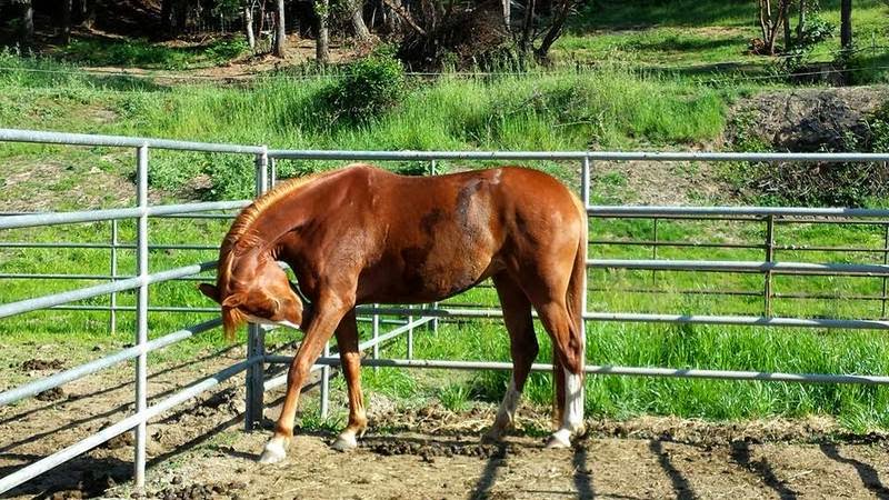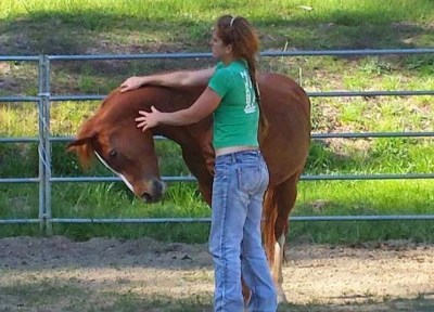 Sheza’s sticky spot is her right ear. Periodically over the last few years as she grew up she would slang her head dramatically away when my hand neared the right ear, and I’d narrowly avoid getting knocked in the head, and I’d handle it until she didn’t react anymore, and that was that. For a week, or a month, and then she’d randomly do it again. Thing is, her mother Desire does the *exact same thing with the same ear.*  In Desire’s case she had TMJ and poll adjustments needed and taken care of a number of times over the last few years, so I can understand a pain origin for her tic, but the fact that her daughter does the exact same thing, and has been checked and wasn’t out of adjustment is pretty interesting. April’s stud and his colt have the same funny head habit as each other as well–ahh, genetics!
