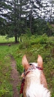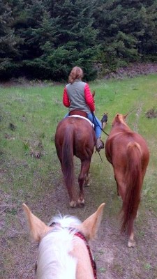 On the third full day there I got to ride April’s home raised palomino QH mare Daisy, ponying Spirit, the grey horse in training that was pictured being ridden some photos back. I first met Daisy and April at Cache Creek 2011 when we camped next to each other and she had baby Daisy along for camping exposure. Time sure flies for these fillies of ours!  It was only Spirit’s second time being ponied and Daisy, by the way, turns 4 next month.  Was I nervous to pony a greenie off a baby greenie? Not in the slightest. One minute aboard Daisy told me that I had to only ask correctly to get whatever I needed as a steady pony horse, if I could just juggle split reins and a 12 ft pony rope–LOL. I did that, rather successfully actually, and we had a blast out on our little trail ride, with April riding family’s big handsome QH mare and ponying Sheza.