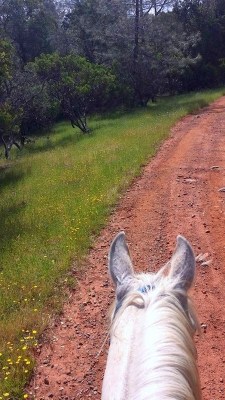 *Scrappy flies delightfully down the trail in a saddle that seems to fit us both great for the next approx 4 months (in winter hair). His sweat marks are pretty darn good but not picture perfect,