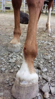 Upon returning an hour and a half later from riding another trainee, April discovered Sheza swollen up and favoring that left front. Here it is cleaned up, clearly minimal, but the swelling and lameness was undeniable: