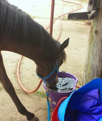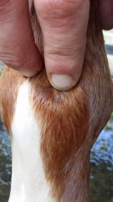 Wednesday evening Sheza went out for a short ride with trainer April, and on return the only thing evidenced was this tiny bloody dot on her left front: