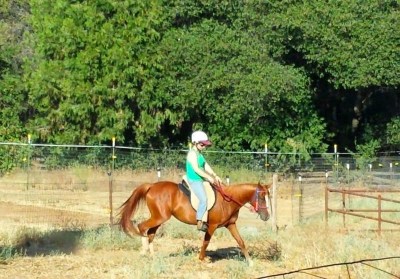 It only took maybe 5 minutes of moving her feet and a few direction changes to have a quiet licking and chewing filly working at a nice trot and not shaking her head. When I saw that we were done and I tighted my girth and got up in that saddle! Just as she had at April’s Sheza stood like a rock, even dropping her head, turning side to side to snuff each of my shoes. We opened the gate from the saddle–ah thank you April for those lovely leg aides installed–and rode out of the round pen and out around the big pasture on a “trail ride” around the little track in the lower acreage my husband scraped in with the tractor.