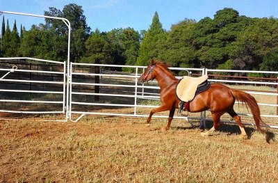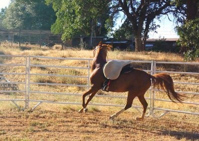 It only took maybe 5 minutes of moving her feet and a few direction changes to have a quiet licking and chewing filly working at a nice trot and not shaking her head. When I saw that we were done and I tighted my girth and got up in that saddle! Just as she had at April’s Sheza stood like a rock, even dropping her head, turning side to side to snuff each of my shoes. We opened the gate from the saddle–ah thank you April for those lovely leg aides installed–and rode out of the round pen and out around the big pasture on a “trail ride” around the little track in the lower acreage my husband scraped in with the tractor.