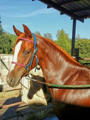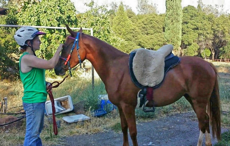 When I found myself sufficiently re-hydrated, and more importantly Sheza had clicked over her brain and found herself standing tied at the Rail of Boredom, I saddled and bridled her, for which she stood like a rock! Sigh, swoon, hallelujah! Then it was time for her to move her feet again with the gear on.