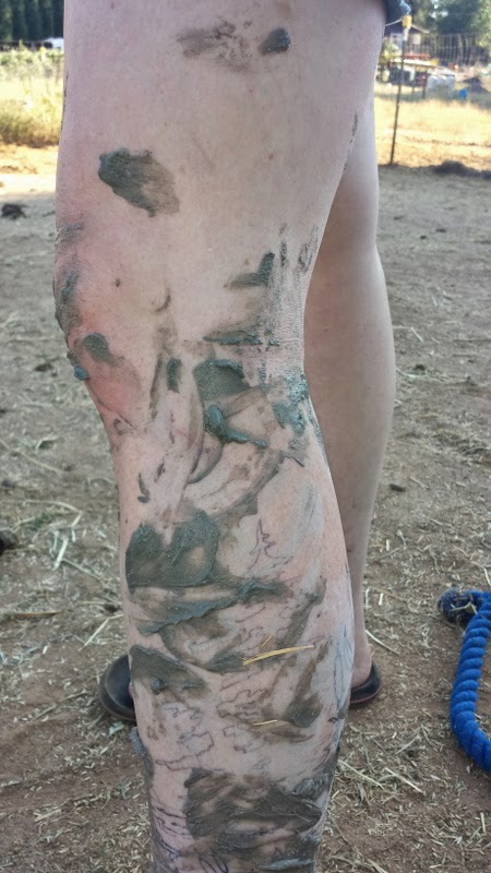 That evening, I also enlisted A’s help in a little horse experiment. Trimming hooves has become nigh impossible this summer after a practically non existent winter, the hooves are rock hard and trying to shed out old sole even with nippers is almost a joke. I personally don’t have enough water to spare to keep their eating areas wet and get a good soak going that way, so I decided to try packing a damp clay poultice into Scrappy’s hooves and then booting and leaving them on overnight. Since I was fairly certain I wasn’t going to ruin his feet overnight but caution is the better part of valor, I only did 2 hooves instead of 4, for starters.