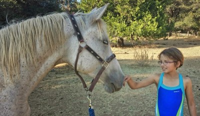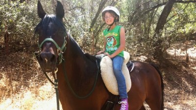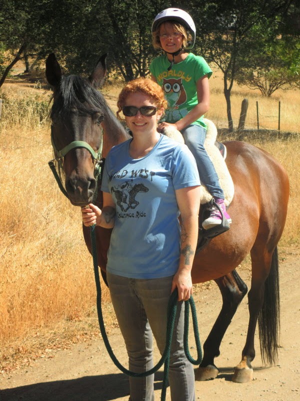 A few days ago, my mom and two young nieces came over from the north coast for a summer visit. The girls had their first horseback riding experiences here two years ago and were ready for another go! It was also my younger niece, A’s, birthday and on the evening of their arrival we had some great cake made by my mom and decorated by A’s sister, M.