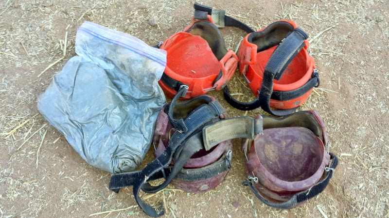 Saturday morning A and I went out eagerly to see how our boot experiment had gone, and let’s just say Trial 1 is a failure, as Scrappy was standing at his fence line eagerly awaiting breakfast with both boot shells slid off and the boots hanging around his ankles. He had a slight wrinkle of consternation regarding the crap attached to his legs by the silly humans last night, but mostly had eyes only for hay. I’m thinking I’ll first try putting less goop in there, as I was pretty generous and I think when he put his foot down into the boot it really smooshed down and got slippery in there. My husband suggested vet wrapping the boot on, which is an interesting idea though I also get a vision of going out in the morning to feed and discovering Scrappy had hogtied himself with slipped vet wrap and muddy boots. Back to the drawing board there, but I’ve got a few idea and will post what comes next as it works out or doesn’t.